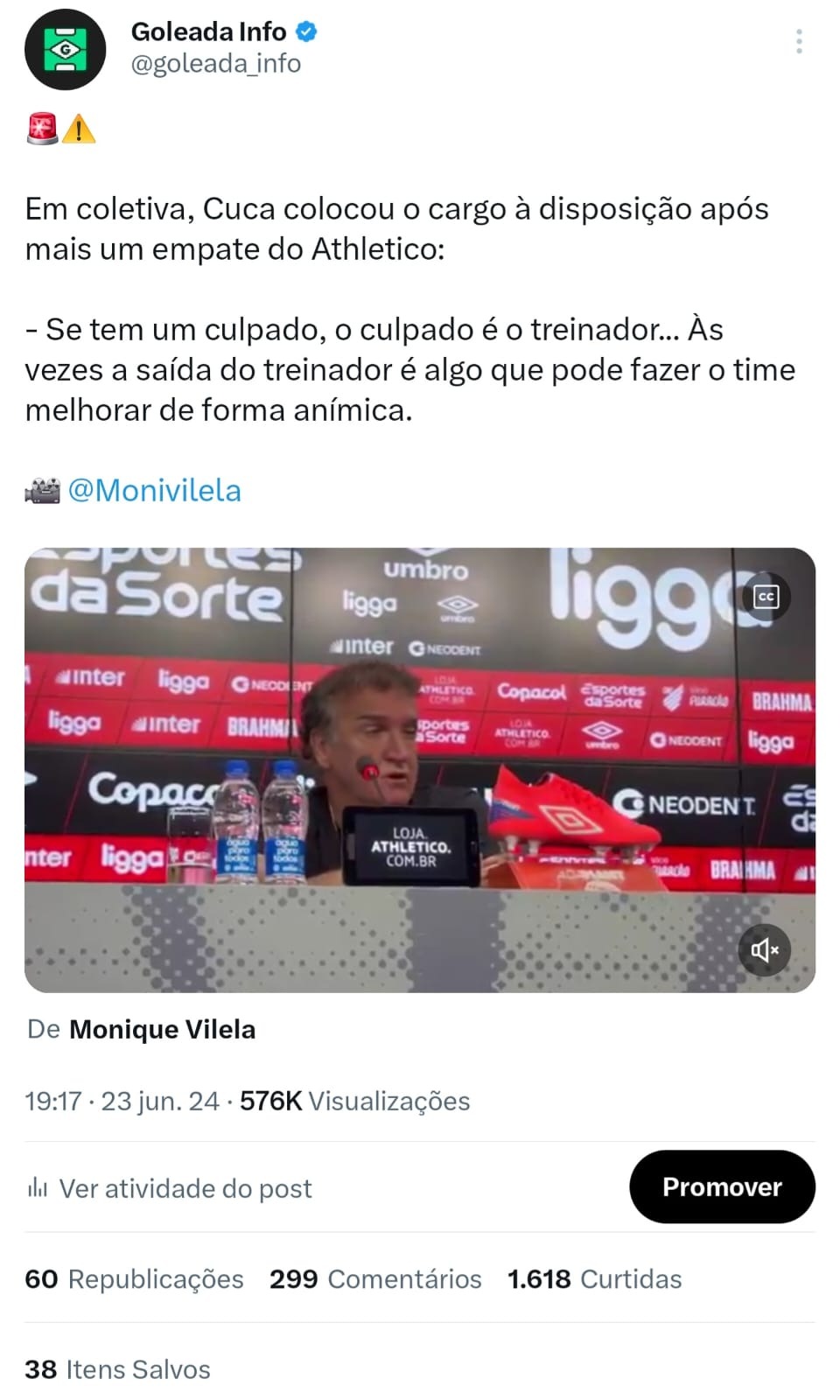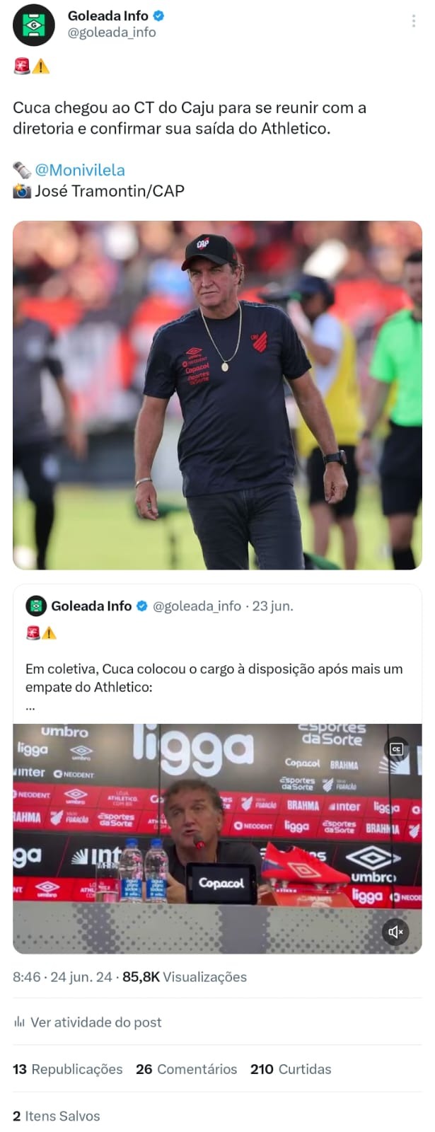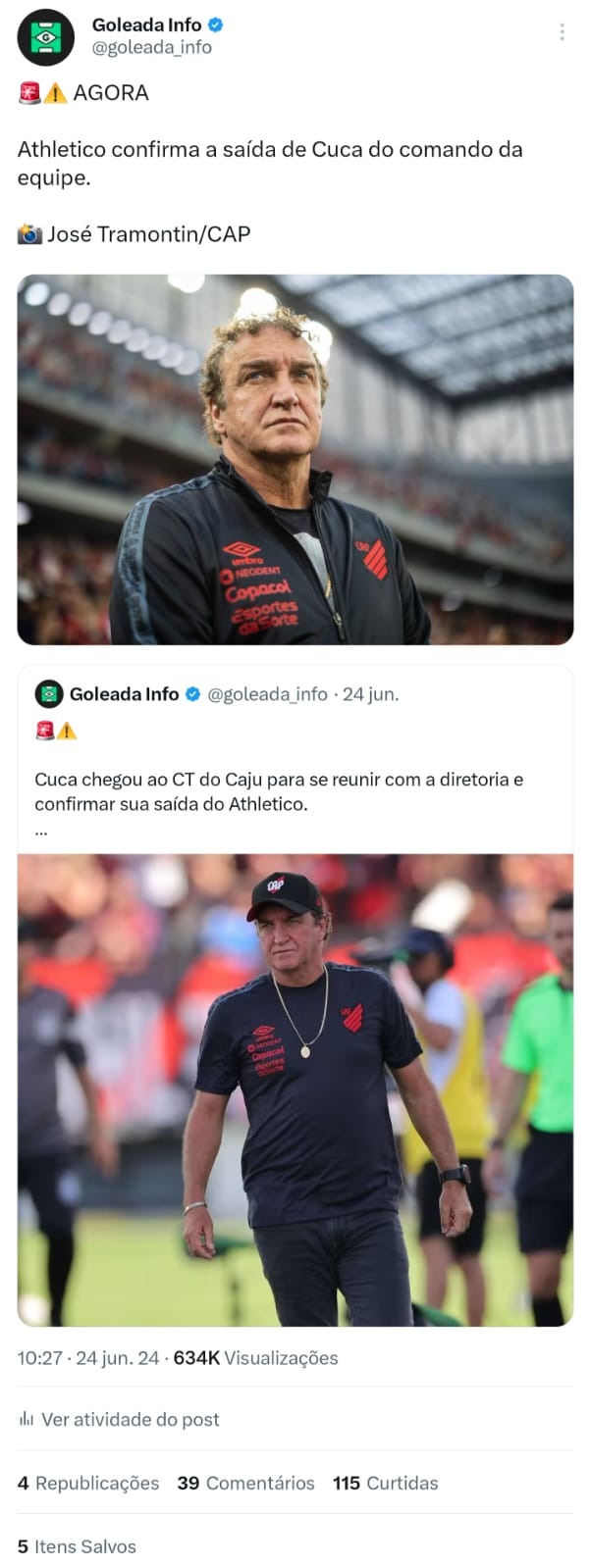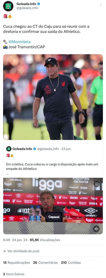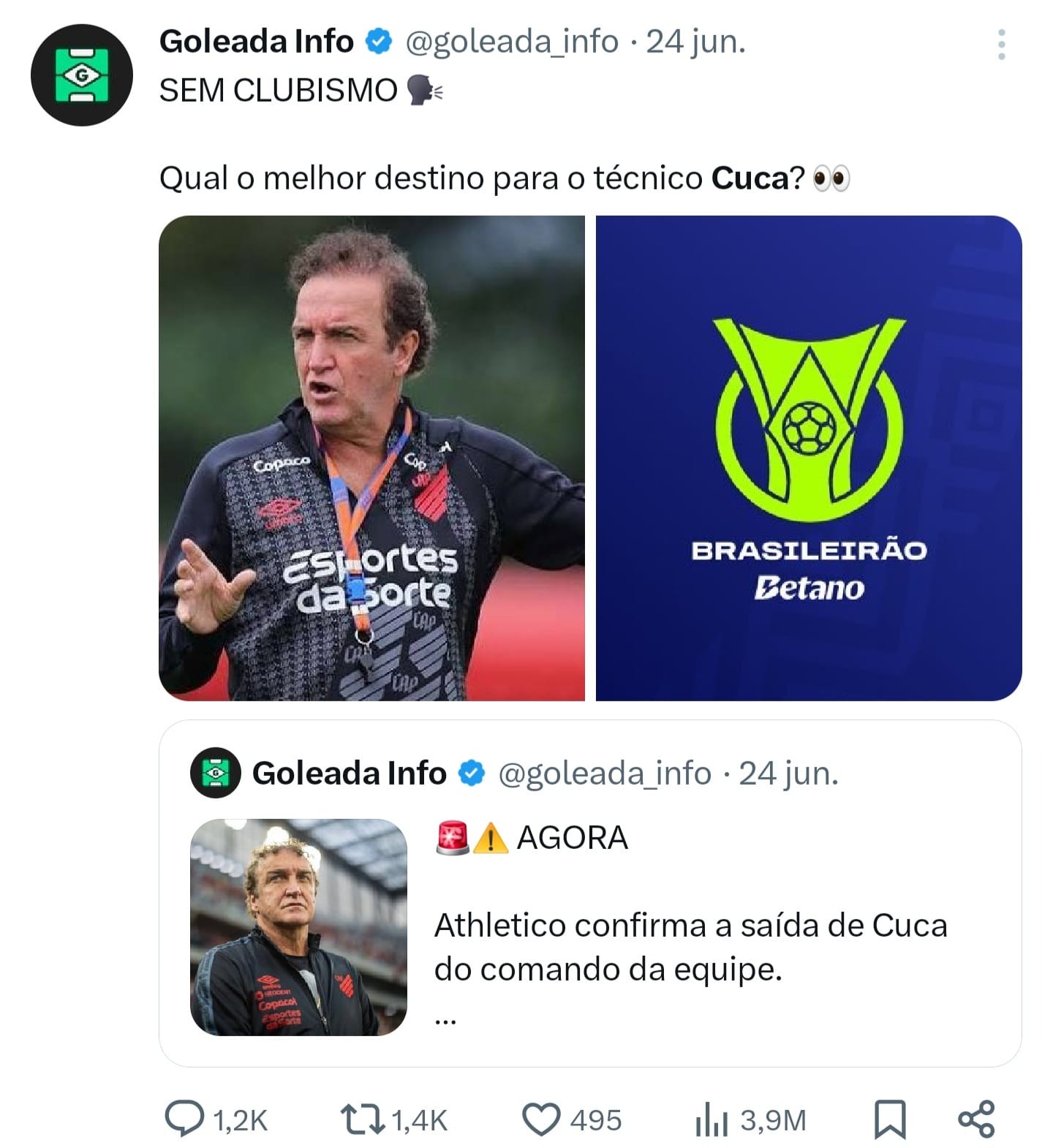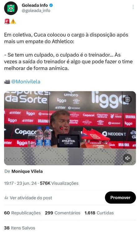 No segundo exemplo, sobre o técnico Cuca, o post alcançou 5,1 milhões de impressões no total. O motivo do número tão elevado, além da credibilidade, é por conta do conjunto de estratégia, como: embedamento, post informativo em tempo real, aspas e o post de engajamento como principal "arma". Vale ressaltar que o timing do post fundamental no resultado final.